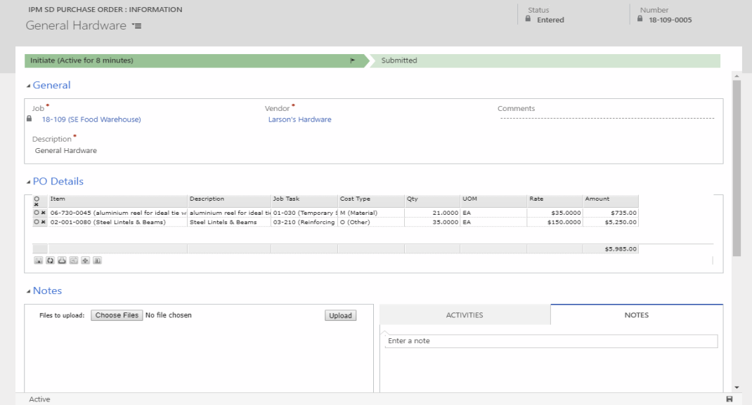 Site Purchase Orders are designed to provide a simpler Purchase Order Entry mechanism for use on site either through a browser or through the Mobile App. The dat entry grid is very simple with a limited number of options. It is a fairly common practice to use Site Purchase orders as Site requisitions where the person entering doesn't have authority to create actual purchase orders but can create Site Purchase Orders and once the Site Order has been workflowed through to a full Purchase Order and approved, they are notified of the Purchase Order number. The main components of the order are:-